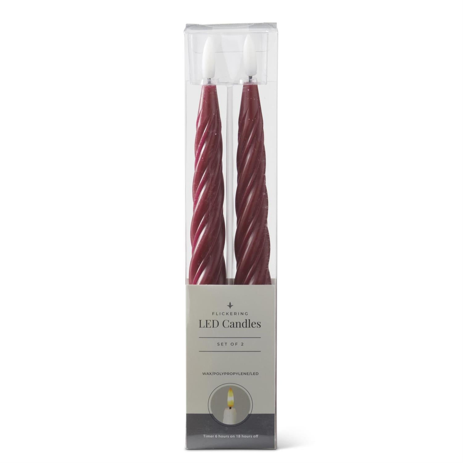 Elevate your home ambiance with these stunning burgundy spiral LED taper candles. Each 9.75" candle features a built-in timer for convenient on-and-off scheduling, perfect for creating the ideal mood without the worry of an open flame. The elegant spiral design adds visual interest to any décor, while the warm LED glow provides safe, flameless illumination. This two-pack offers exceptional value for decorating multiple rooms or refreshing your seasonal displays. Ideal for dinner tables, mantels, or special occasions—enjoy the beauty of candlelight with modern convenience and peace of mind.