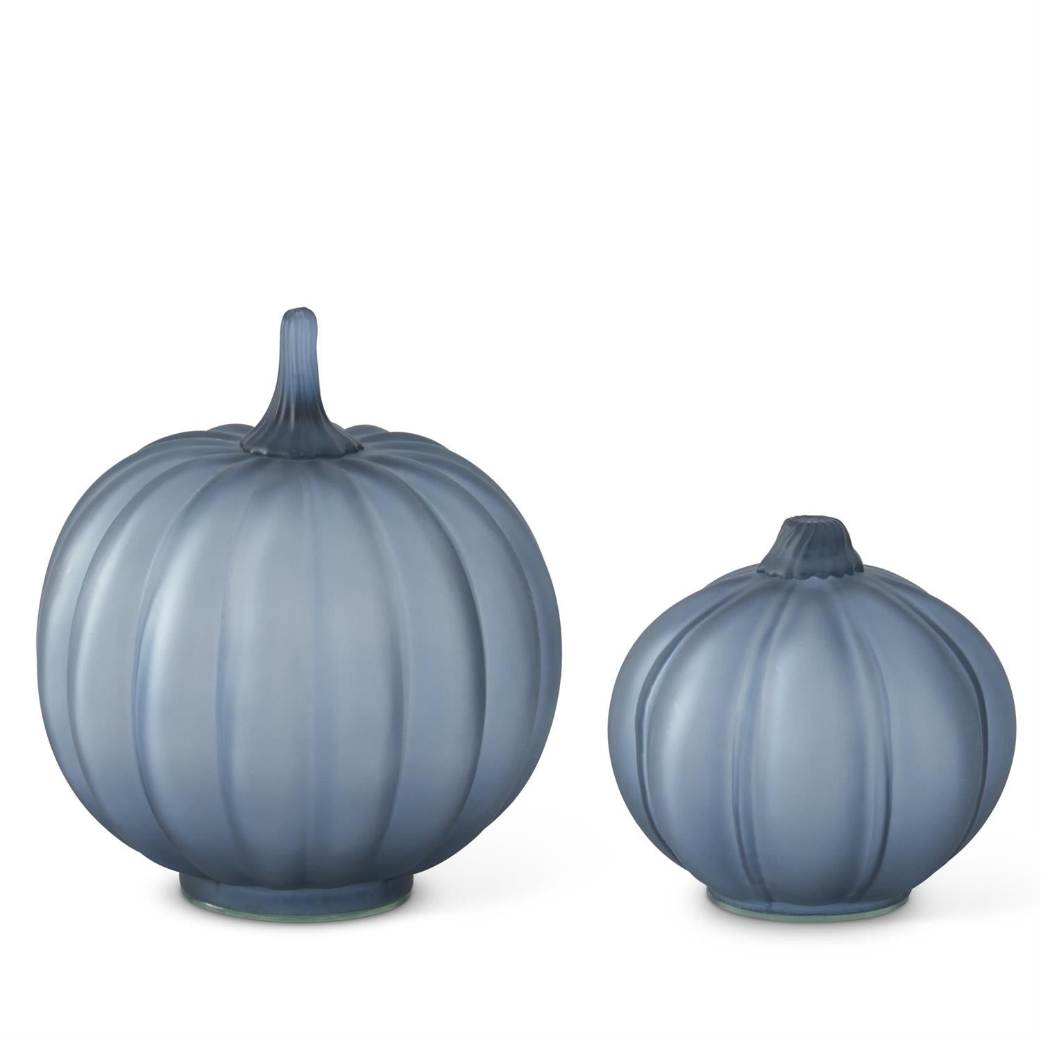 Celebrate the season with this elegant 9" Frosted Blue Glass Pumpkin. Its subtle frosted finish adds a cool, sophisticated touch to your Halloween or fall decor. Perfect for tabletops or mantel displays, this unique pumpkin blends traditional charm with a modern twist, creating a captivating centerpiece that enhances any autumn setting. Embrace seasonal style with a piece that stands out from the usual orange décor.