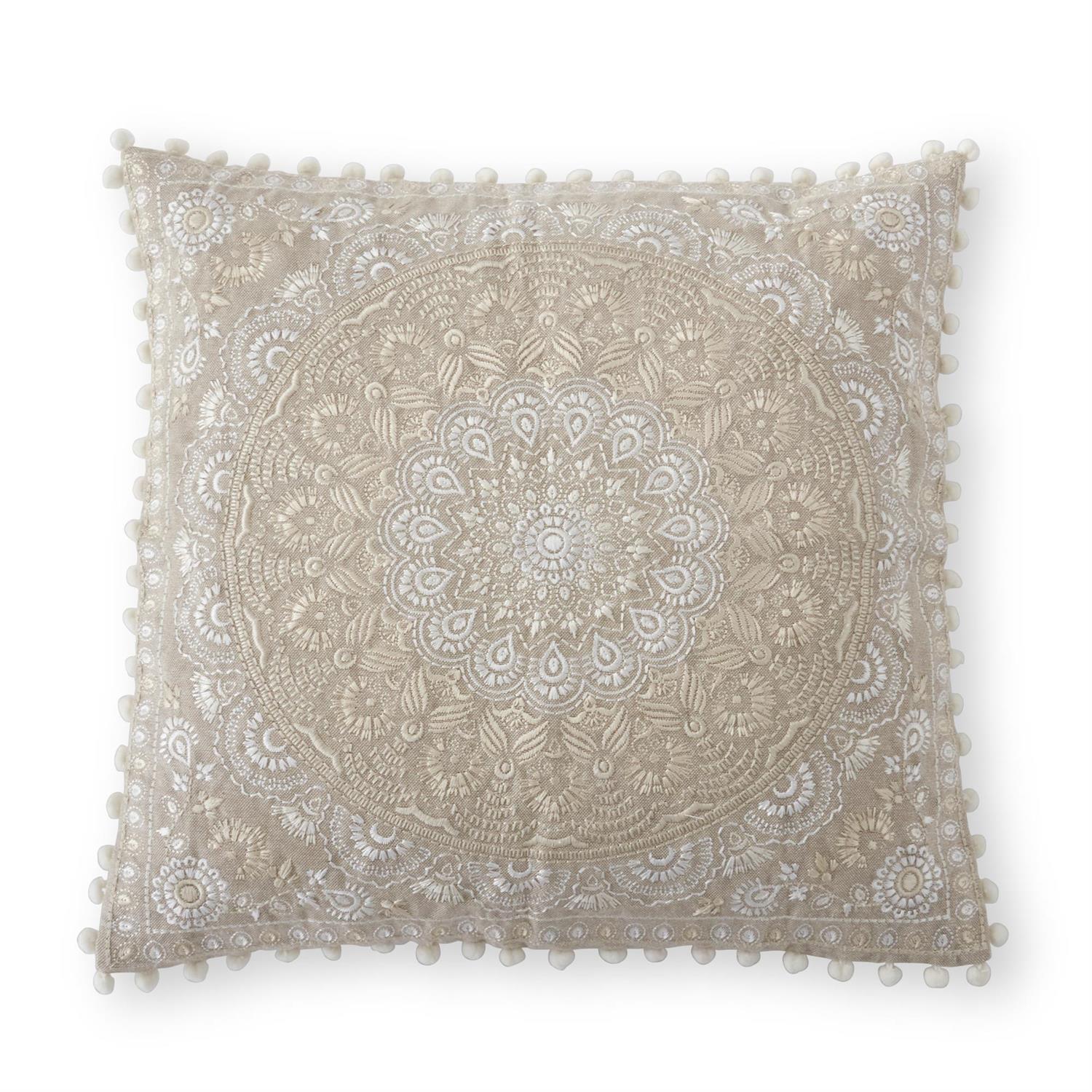 Tan Medallion Embroidered Pillow Pompom Trim - 20", Square
